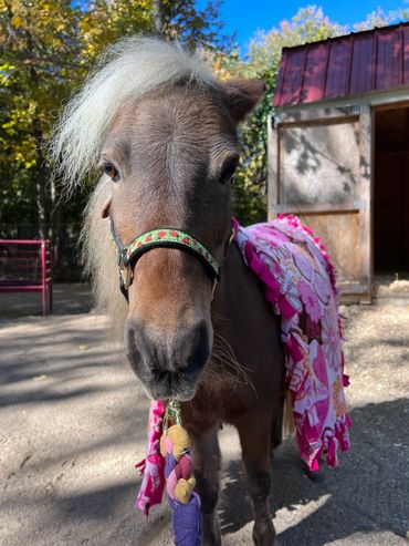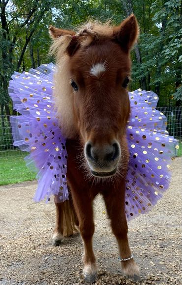 Joy, a 5 year old miniature mare. She is full personality and ENERGY!!!! She loves attention and loves to get dressed up in just about anything! She is brave, and loves trying new things and activities. Loves to be busy. Joy is a big hit whenever she wears her tutu and anklet! Joy loves to have selfies taken with you!
